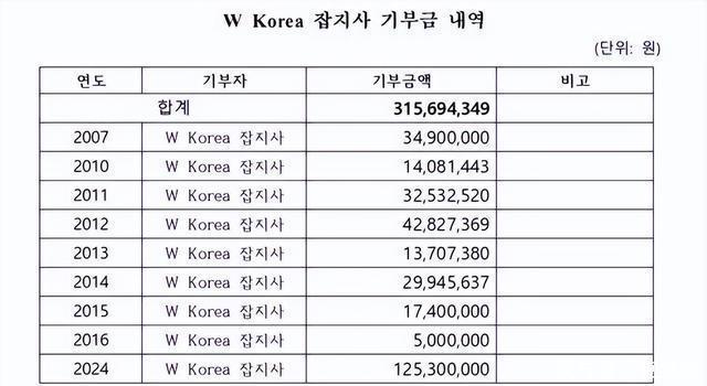 (推特网友评论) 资金流向不明 既然是慈善晚宴,那捐款肯定是重中之重。 根据D社爆料,WKOREA一直标榜自己20年累计捐款11亿韩元(约550万人民币),其实细算下来平均每年才5500万韩元(约27.5万元人民币)。 而国会资料显示,就这钱还是谎报的。 在2007年到2024年11月长达17年的时间里,他们实际捐给乳腺健康财团的只有3.1569亿韩元(约157.8万人民币),而且2017到2023年整整七年一分钱没捐!2024年才突然捐出1.25亿韩元(约62万人民币)。 钱去哪了?