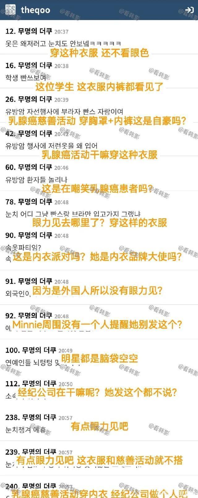 (捐款信息) 再算算慈善晚宴的实际收入。光是今年单次活动,D社确认的掏腰包赞助的时尚品牌就有29个,有香奈儿、路易威登、古驰等奢侈品大牌。 时装品牌们以3000万韩元的价格购买入场券,珠宝品牌的赞助价格为500万韩元,仅这部分就募集了近10亿韩元的赞助(约500万元人民币)。 可没人知道这些钱的去向。 活动现场甚至出现了戴森吹风机和酒的软广,也不知道"强力性能的吹风机"及诱导艺人举杯,和乳腺癌防治又有什么关联性, 乳腺癌患者甚至无法饮酒 …为了钱,不该植入的也要强行植入。 而艺人们声称他们参与活动并没有演出费用, 发型和化妆费用也是自费,除了赞助商品牌提供的单品,部分造型费用也自行解决,所以在邀请明星上面,活动方根本不花钱。 一边收品牌赞助,一边利用明星做免费宣传, 这么多年捐的款加起来还不如今年单场的品牌赞助费多… 内场艺人毫无尊严 内场有一个"禁止经纪人入内"的规定,艺人们在活动现场完全没有任何保障,只能无底线地满足活动方临时提的各种要求。 比如aespa成员柳智敏被要求配合《Sugaronmytongue》的性感歌词做出挑逗动作,这种性感的表演内容和公益活动宗旨毫无关联。 而她的经纪人被拦在场外,只能眼睁睁看着艺人被摆布。 经纪公司相关人士无奈地表示:“那部分并不是事先协商好的内容。因为经纪人没能进入活动现场,我们完全无法掌控内部情况。” 根据D社获取的官方通知显示,这个解释可能是真的。 因为在第一部分活动中,“禁止工作人员陪同进入”的规定被强调了四次以上,派对也限制只能带一名工作人员进场,内场似乎变成了私家法外之地。