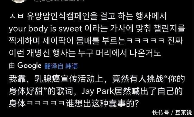 (内场照片) 在活动方眼中,乳腺癌防治只是个用来装点门面的工具,办派对的借口。 而明星们似乎也只把这场活动当自己出图的时尚晚宴、增加曝光度的舞台。 比如表演环节,朴载范登台演唱了他的名曲《身材》,歌词里面的"你胸前的一对双胞胎姐妹"激怒互联网。 这首歌不光有性暗示,甚至还在往乳腺癌患者的伤口上撒盐。