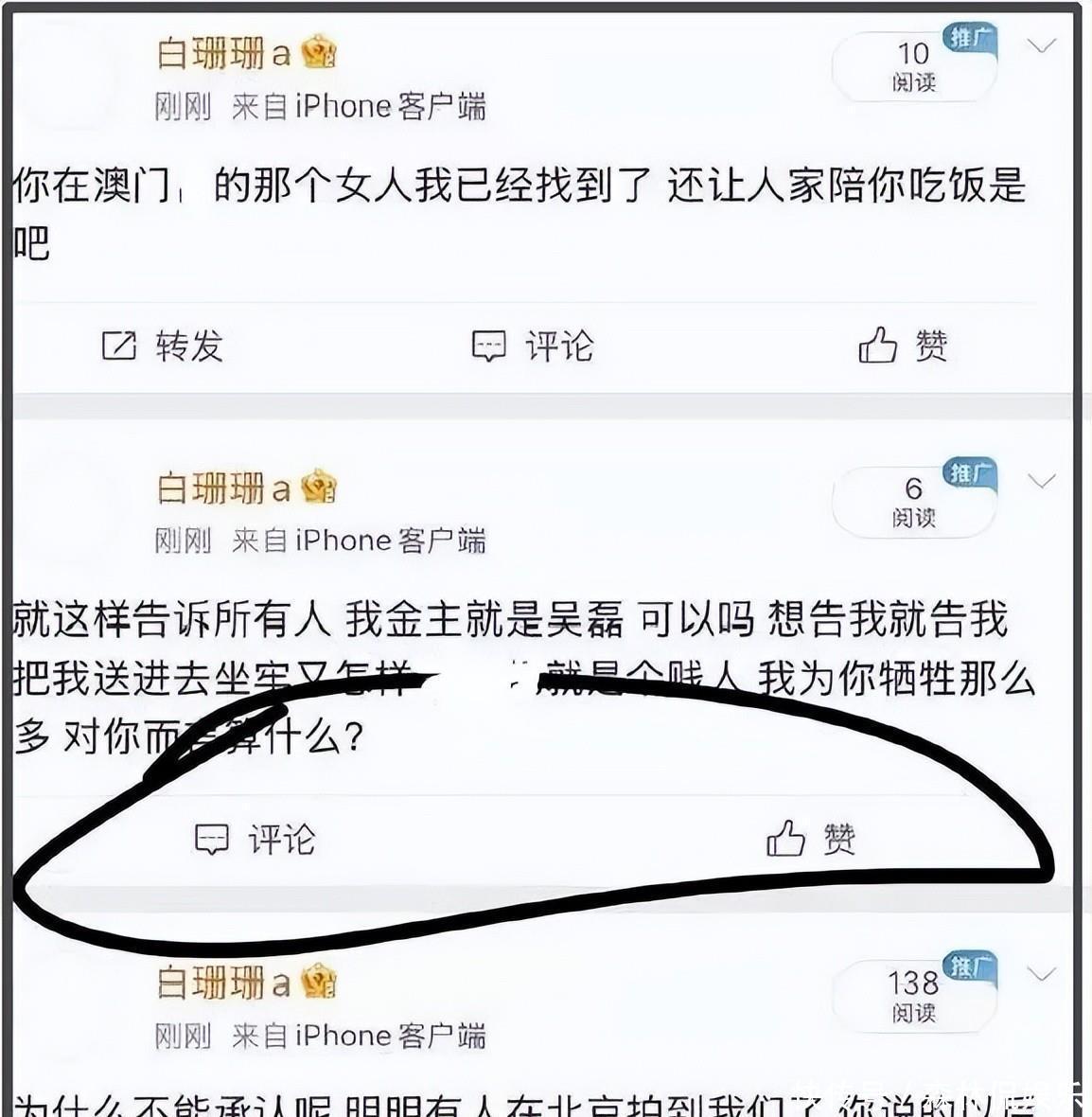 关于澳门20日发生的事情,白珊珊发了太多吐槽文,其中还直接表示吴磊是自己的金主,怒骂吴磊想告就告,不怕被送进牢,斥责吴磊对不起自己的牺牲。更重要的是她还直接说清了20日的事情,称已经找到吴磊睡的女人了,两人不仅睡了还吃了饭。同时,她还表示跟吴磊曾经在北京被拍到了,质问为什么不承认,承诺的以后不知道是什么时候。由此来看,她对这段感情破防的原因是承诺没有兑现,恍然大悟自己被耍了。