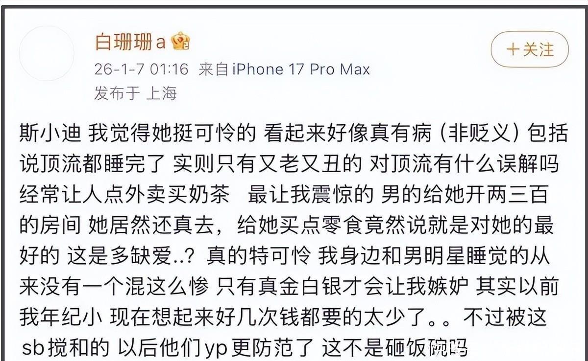 此前,白珊珊发文嘲讽司晓迪睡的跟顶流没有什么关系,都是“又老又丑”的明星,质疑她的品味,内涵她廉价,大大卷坏了市场,砸了饭碗。但司晓迪好歹有聊天记录及照片等,白珊珊却都局限在文字,真实性存疑。