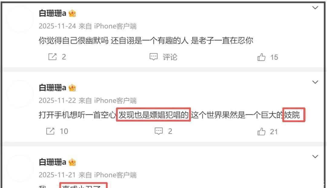 再结合白珊珊11月20日之后的博文,发现她吐槽的“嫖娼”、“妓院”、“小丑”等跟“违法”劈腿强相关,被认为是在隐射“2025年11月20日”发生的事情。
